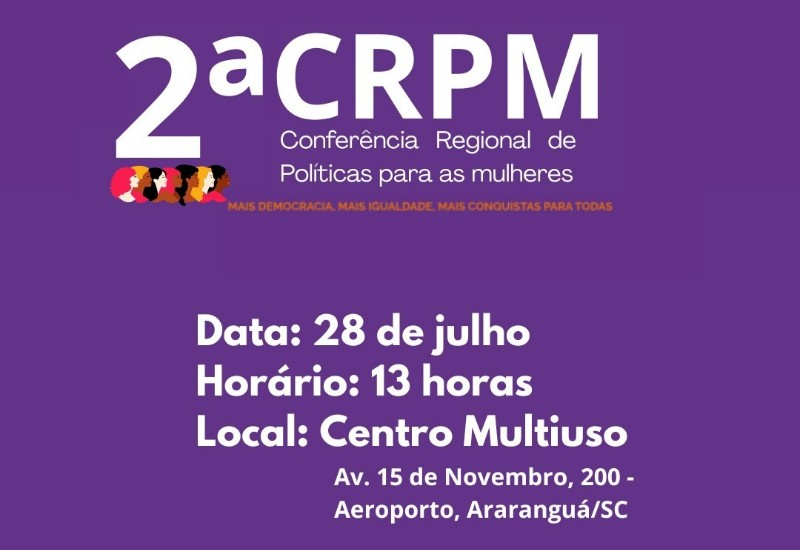 A cidade de Araranguá será palco da 2ª Conferência Regional de Políticas para as Mulheres (CRPM), marcada para esta segunda-feira (28), às 13h, no Centro Multiuso, na Av. XV de Novembro, nº 200. O evento é promovido pela Administração municipal, em conjunto com o Conselho Municipal dos Direitos da Mulher.