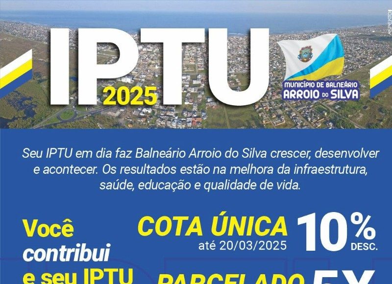 Os contribuintes de Balneário Arroio do Silva devem ficar atentos aos prazos para pagamento do IPTU. A cota única, com 10% de desconto, vence no dia 20 de março. Quem optar pelo parcelamento deve saber que a primeira parcela também vence na mesma data.