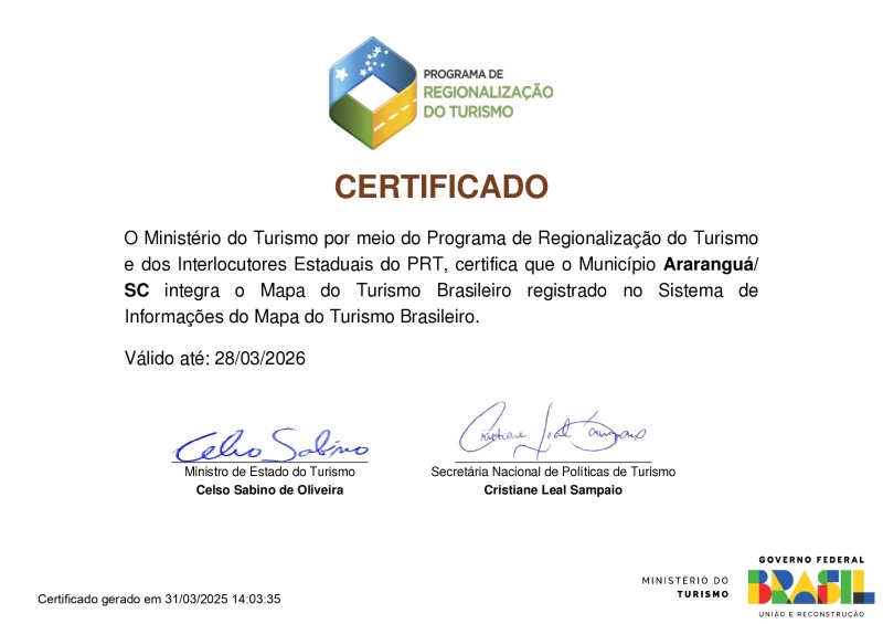 A secretaria de Turismo de Araranguá comunicou, à tarde de segunda-feira (31), sobre a cidade ser oficialmente categorizada como Município com Oferta Turística Complementar, pelo Ministério do Turismo, por meio da nova portaria.