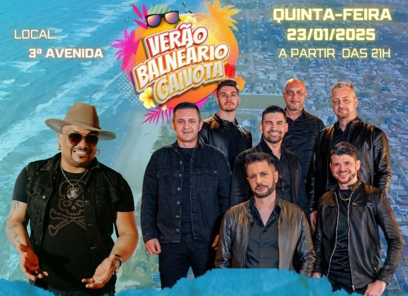 Praia, sol e atividades na quadra, areia, mar e lagoa. O calendário de eventos do Verão 2025 de Balneário Gaivota segue a todo vapor nesta quinta, sexta, sábado e no domingo. Nesta quinta-feira (23), tem shows no palco da Terceira Avenida, com a Banda Brilha Som e o cantor Cesar Moreno e banda. As atrações iniciam às 21h30 e são totalmente gratuitas. Na sexta-feira (24), na Arena Poliesportiva do bairro Turimar acontece mais uma rodada do Aberto DUNET de Futsal, a partir das 18h30. No sábado (25), acontece a primeira etapa do Circuito de Vôlei de Praia, na arena em frente à Passarela Central.