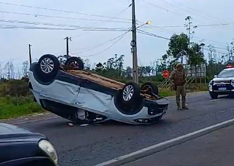 Uma forte colisão entre dois veículos foi registrada na manhã desta sexta-feira (24) na rodovia José Tiscoski (SC-449), que conecta os municípios de Sombrio e Balneário Gaivota. O acidente ocorreu logo após o bairro Lagoa de Fora, às 10h, sentido Balneário Gaivota, e deixou um dos automóveis capotado no meio da pista.