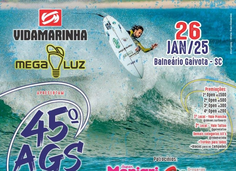 A Praia Central de Balneário Gaivota, no extremo sul de Santa Catarina, sedia em 26 de janeiro (domingo), o 45° AGS Open de Surf, apresentado por Vida Marinha e Mega Luz.  O evento é homologado pela Federação Catarinense de Surf (FECASURF).