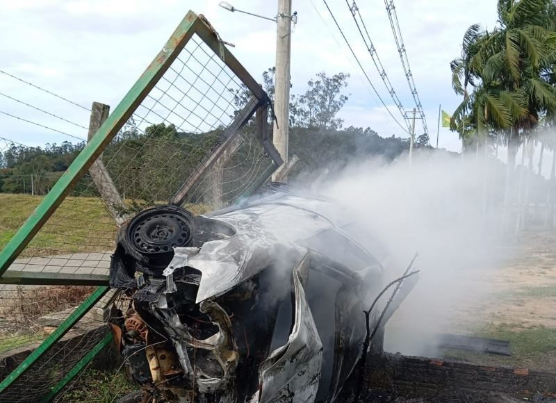 Um violento incêndio consumiu um Volkswagen Gol na tarde deste sábado (14) em Turvo, deixando um rastro de destruição e um enigma para as autoridades. O Corpo de Bombeiros foi acionado por volta das 12h40 para a Estrada Geral São Peregrino, onde o veículo colidiu contra um muro de alvenaria e foi completamente tomado pelas chamas.