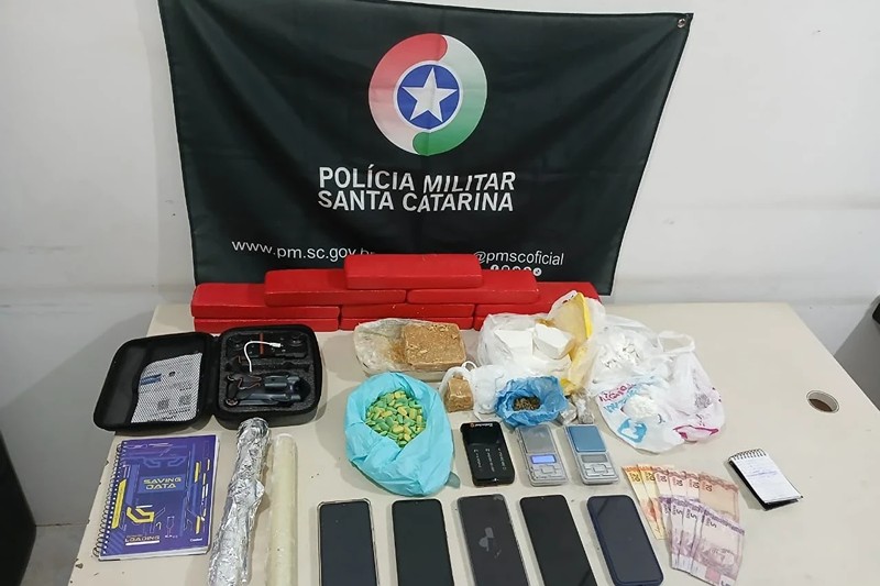 A ação policial também resultou na apreensão de duas balanças de precisão, um drone, uma máquina de cartão e celulares. A ocorrência começou após a guarnição avistar a jovem entregando um volume a um motorista. O condutor foi abordado e flagrado com uma pedra de crack, o que motivou o retorno dos policiais à residência.