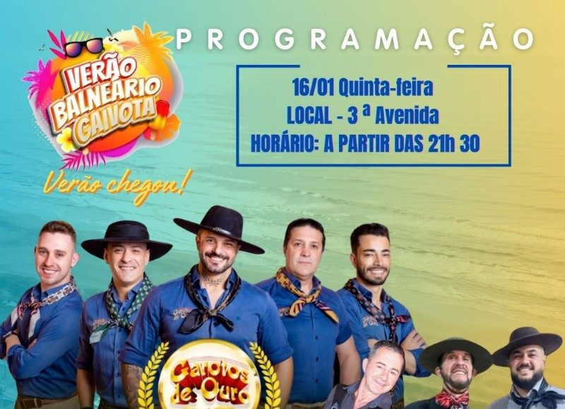 Prepare-se, porque a Terceira Avenida de Balneário Gaivota vai tremer nesta quinta-feira (16)! A partir das 21h30, a cidade será tomada por uma noite de pura tradição e alegria com o show gratuito de um dos maiores grupos de música regionalista do Sul do Brasil: Os Garotos de Ouro.