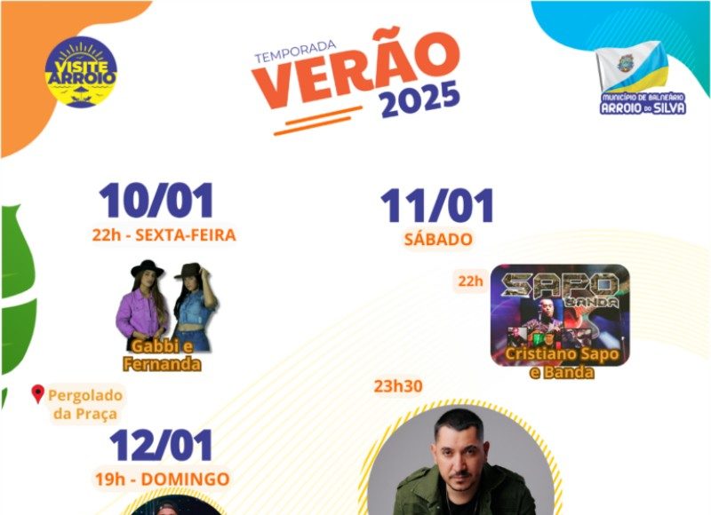 Mais um fim de semana promete ser movimentado em Balneário Arroio do Silva. A programação da temporada de verão está repleta de atividades e, neste próximo fim de semana, será marcada por shows e atividades de esporte e lazer.