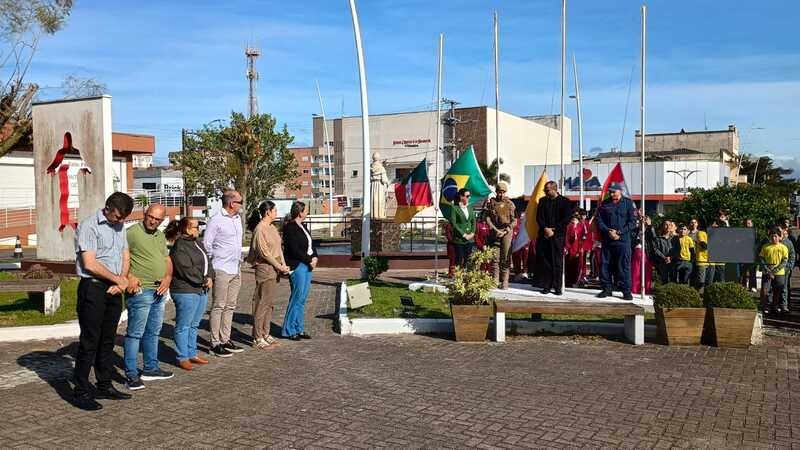 Alunos de escolas municipais, estaduais e privadas participaram da atividade que contou com o hasteamento das bandeiras de Sombrio, Santa Catarina, Brasil e Vaticano. A solenidade teve início na Rua Coberta, com a fanfarra do CEAC até a Igreja Matriz de Santo Antônio de Pádua, onde as demais autoridades e participantes já aguardavam. Após a benção do padre Fábio, o grupo Som, Voz e Harmonia executou os hinos de Sombrio e do Brasil.